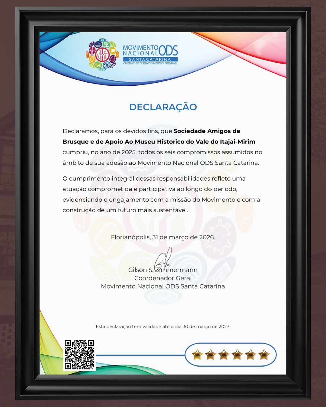 O documento, emitido no dia 31 de março de 2026 pelo Movimento Nacional ODS Santa Catarina, atesta que a nossa instituição cumpriu todos os seis compromissos assumidos em nossa adesão ao movimento. As seis estrelas presentes em nosso certificado representam uma atuação comprometida, participativa e focada em deixar um legado positivo não apenas na memória, mas na prática diária da nossa comunidade.